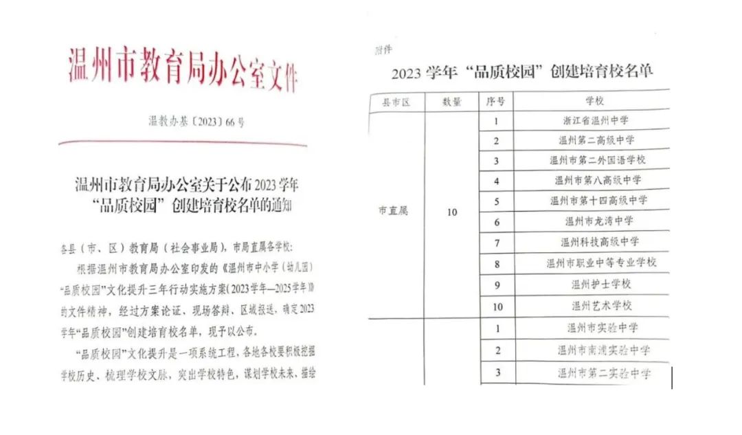 温州市2023学年“品质校园”创建培育校文件