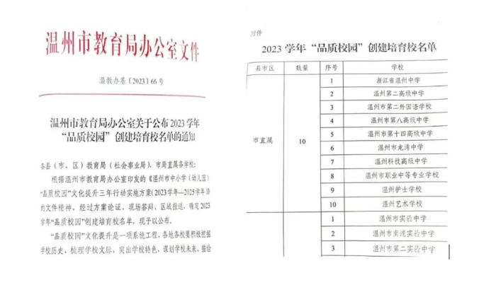 同期,温州市教育局开展了全市中小学(幼儿园)“品质校园”文化提升三年行动,经过现场答辩、专家评审等环节,我校被确定为温州市2023学年“品质校园”创建培育校。