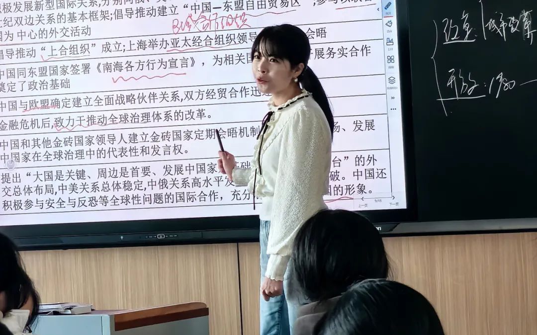 第一节由我校吴晓捷老师执教,她以困局、破局、发展三维度层层剖析《中外历史纲要上册》第27课《中国特设社会主义的开创与发展》;以学生学案中整理的改革开放关键事件和政策的轴线的真实照片,在课堂中掀起评价与完善补充的探讨热潮。最后,在与学生共同探讨中国特色社会主义理论体系与改革开放之间的关系中提升收尾。