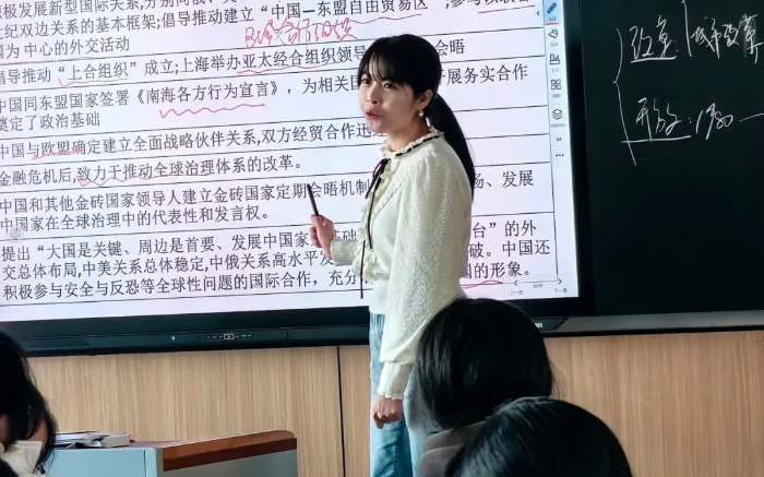 第二节研讨课由温州市第二高级中学的余诗榕老师执教,余老师以1984年、1991年、2007年、2023年温州城市卫星图抓人眼球,通过温州的城市发展变化引出《中外历史纲要上册》第28课《中国改革开放和社会主义现代化建设的成就》。指导学生分组分别讨论“综合国力不断提升”、“国际影响力不断扩大”、“祖国统一大业”三大成就及其他们之间的逻辑关系。注重学生概括能力、分析能力、家国情怀等素养的落地。