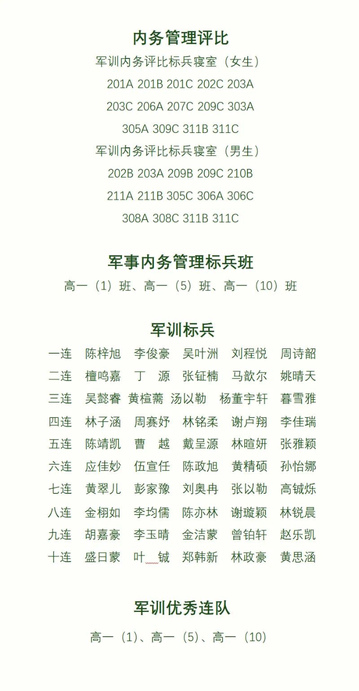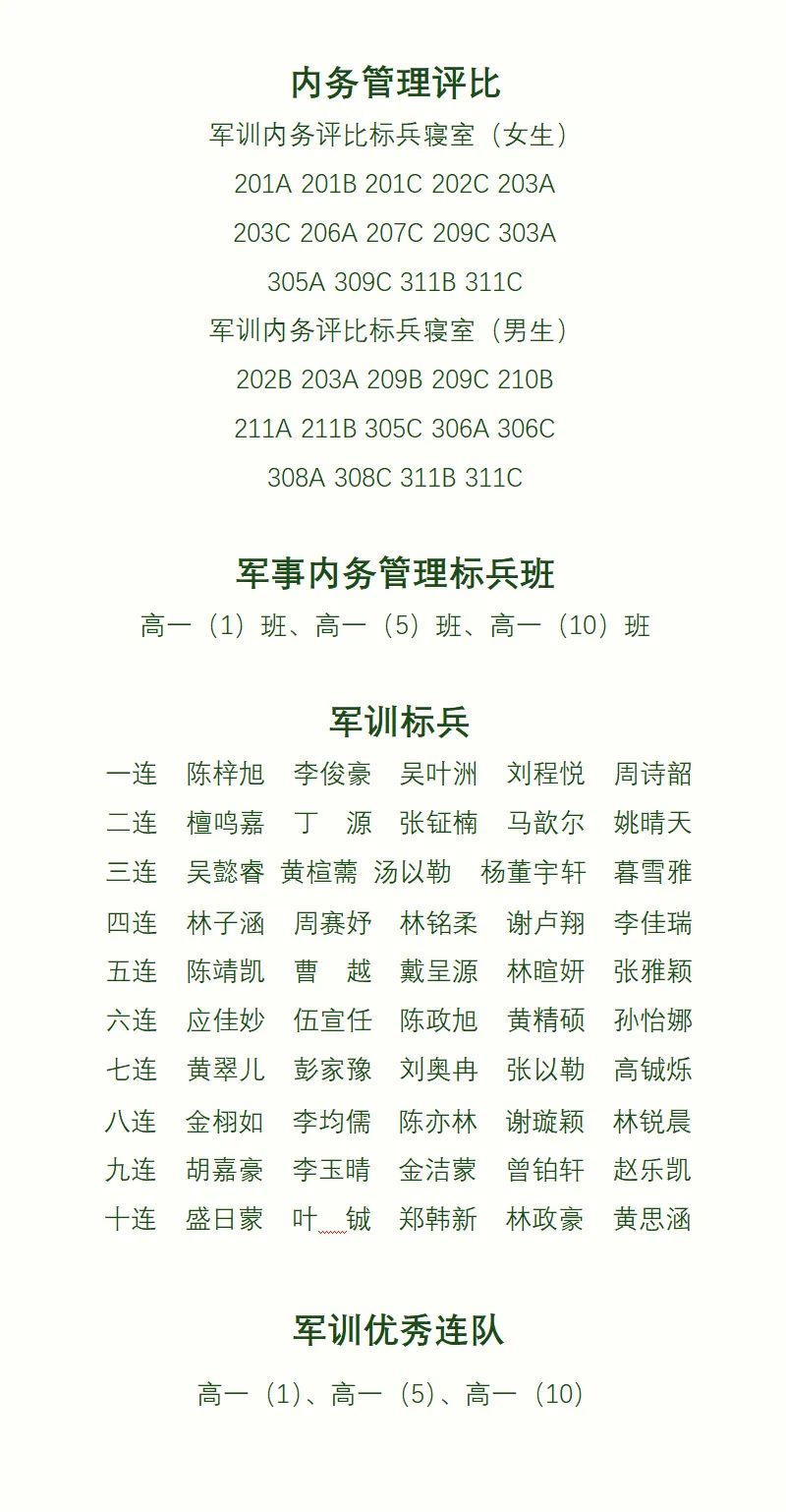 在军训过程中,许多先进集体和优秀个人脱颖而出,梅捷凯校长宣读了本次军训标兵、军训优秀班集体等名单,所有出席校领导为获奖集体代表和个人颁奖。