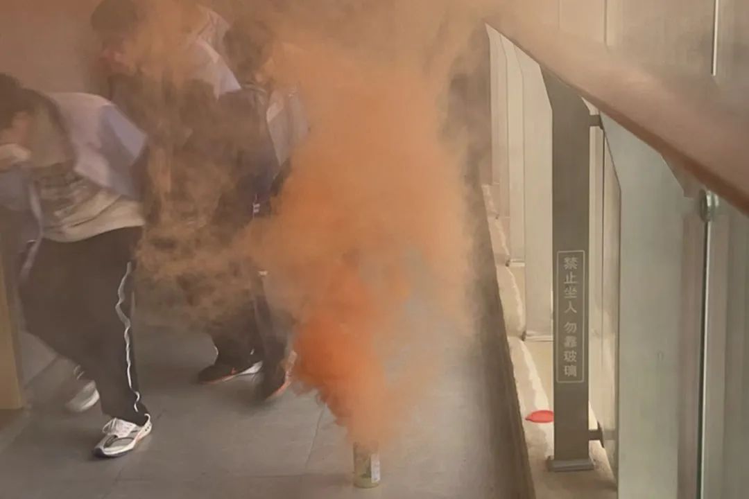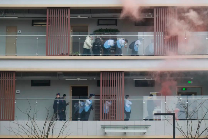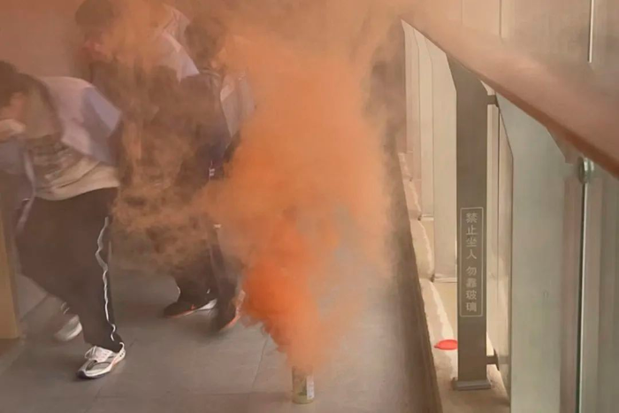2月28日中午12时许,疏散演练准备就绪。随着急促的警报声响起,施放员老师点燃预放在楼道内的烟雾弹,学生公寓内顿时浓烟弥漫,消防疏散演练正式开始。