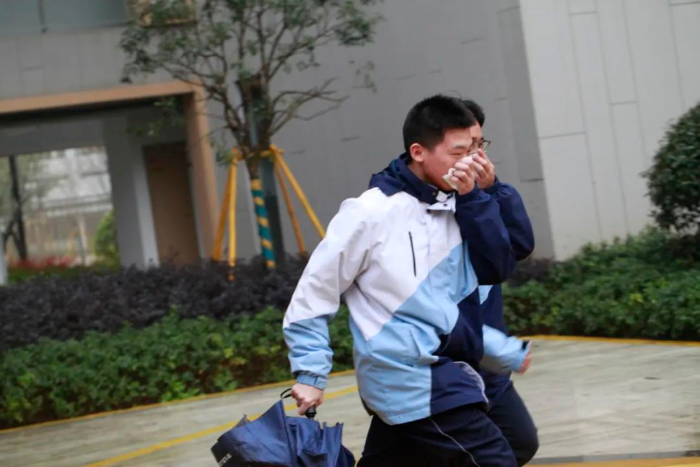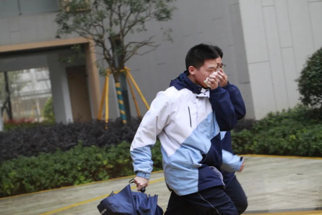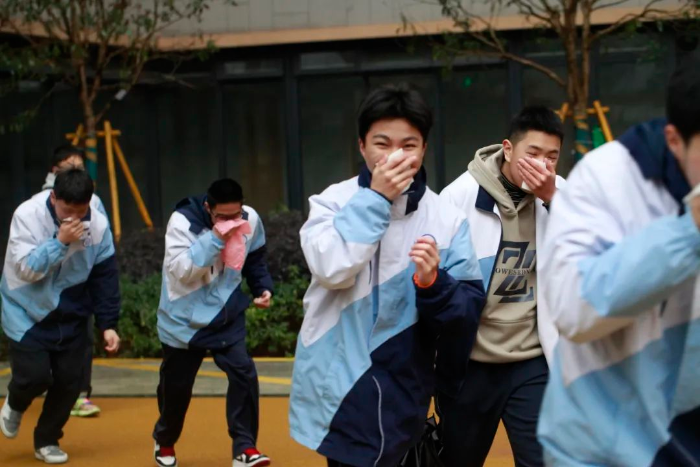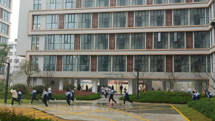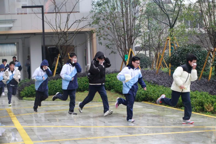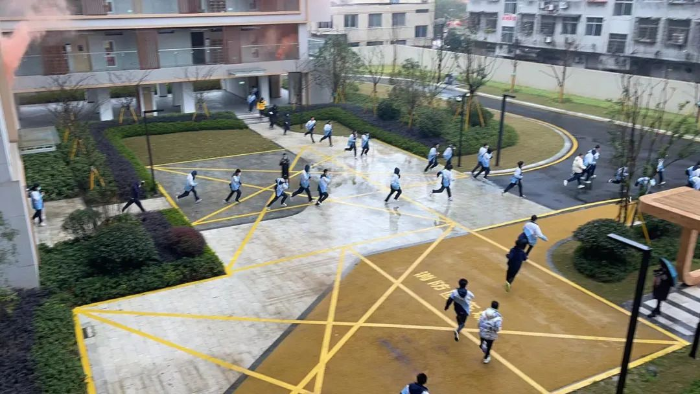 原本在午休的同学纷纷用湿毛巾捂住口鼻,快步有序地从寝室跑出,按照安全路线撤离到操场上。